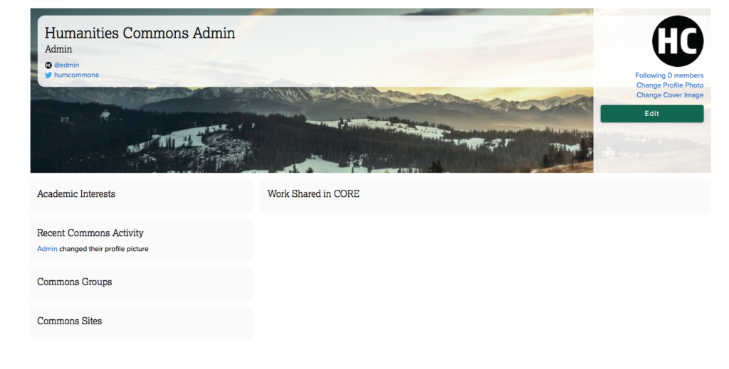 Your name, title, and institutional affiliation (“Humanities Commons Admin” in this case) will be filled in automatically by the Commons based on your membership information. The Commons will also assign you a generic image as your profile picture. Let’s start customizing your profile by changing your picture, called an “avatar.” Click “Change Profile Photo” at the top right hand corner of your profile.