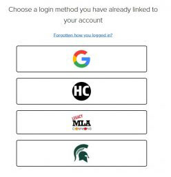 After clicking the link in your e-mail, you’ll see a screen that asks you to choose your log-in method. You have four options: Sign In with Google, MLA Legacy Commons, Michigan State University Single Sign-On, or click the link at the bottom of the screen to Create a New Humanities Commons Log-In. Signing in with Google will let you enter with any Gmail account username and password, regardless of the e-mail address you used on the registration form in the previous screen. If you choose to create a new Humanities Commons log-in, you’ll create a username and password that you’ll only use on this site.